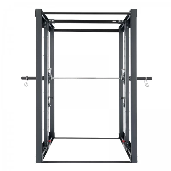 - Verriegelung der horizontalen Laufschiene in drei Positionen ermöglicht das Training wie in einer traditionellen Smith-Maschine.