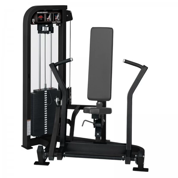 Die Brustpresse (Bankdrück-Übung) gehört zu den essentiellen Grundübungen im Fitnessbereich und gilt als fundamentaler Baustein für den Fortschritt im Krafttraining. Nahezu jedes Fitness-Studio und jede Fitnesseinrichtung verfügt über mehrere Brustpressen und Bankdrück-Optionen, da sich diese Übung stets größter Beliebtheit erfreut. Mit der Hammer Strength by Life Fitness Kraftstation Select Chest Press lässt sich die Brustmuskulatur äußerst komfortabel trainieren. An dem Gerät befindet sich eine Anleitungstafel, hier wird die richtige Übungsausführung der Chest Press noch einmal bildlich dargestellt. Die reibungslos laufenden und genormten Kabelzüge ermöglichen einen runden Bewegungsablauf und eine optimale Beanspruchung der benötigten Muskulatur. Die ergonomisch gefortmen Handgriffe, bieten optimale Griffmöglichkeiten und sicheren Halt. Außerdem sind diese Feuchtigkeitsabweisend.